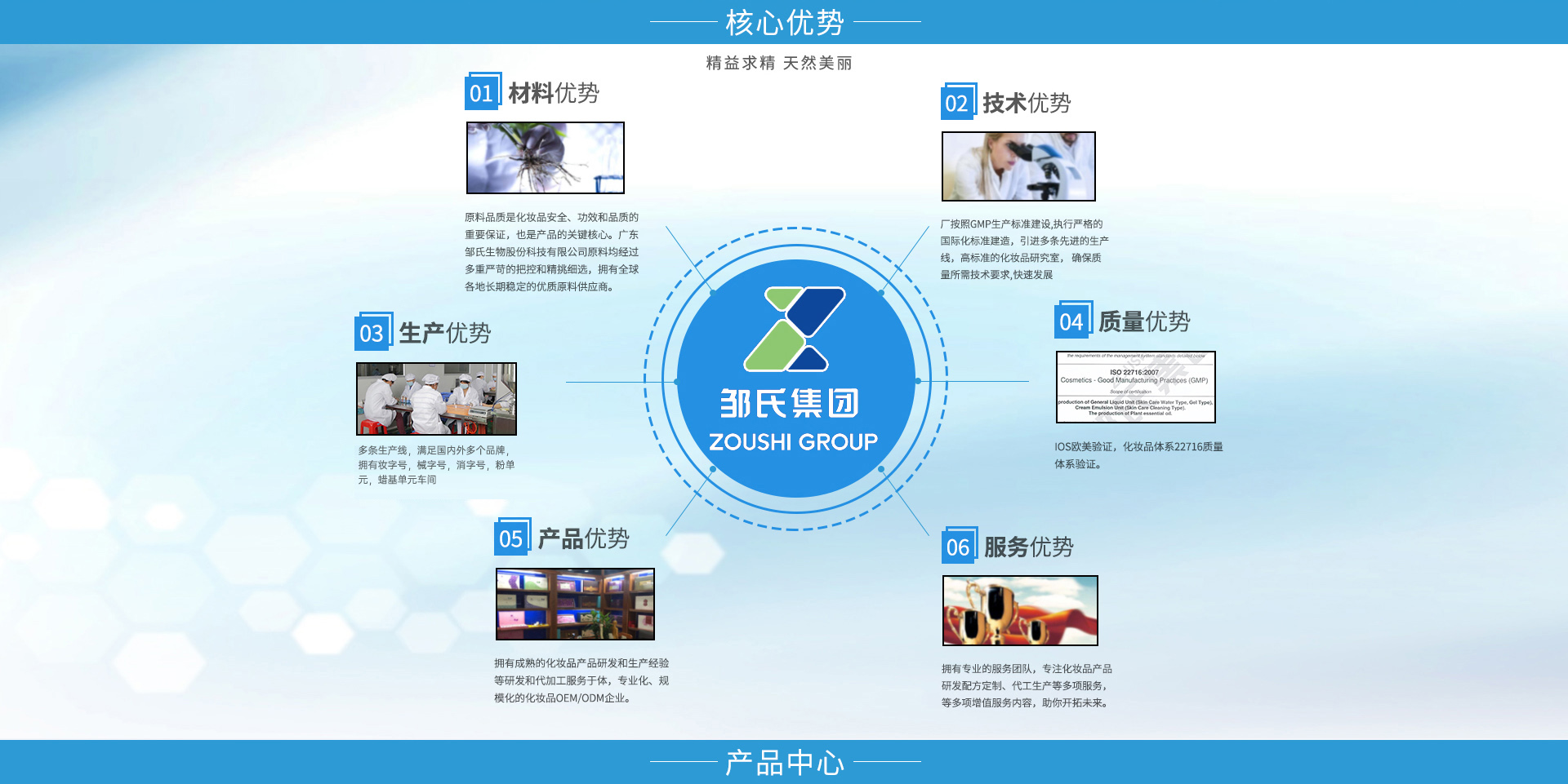 廣東鄒氏生物科技股份有限公司是一家集原料研制、配方開發、加工生產及配套性服務為一體的全球化化妝品OEM/ODM服務企業。鄒氏生物秉承“精益求精,天然美麗”的經營理念,始終孜孜不倦的在美業領域深耕,經過不斷發展完善與技術提升,在行業內頗具口碑和影響力。公司擁有雄厚的資金實力、先進的生產設備以及大批高精專的人才儲備,旨在打造一個純自主研發,純自主生產以及管理的高科技日用美妝OEM/ODM品牌。 在延續高質量產品和服務的同時,鄒氏生物始終秉承著純粹的生產理念,在研發、生產、品控、營銷等多方面升級,配備雄厚的科研力量,引進先進生產設備,遵循嚴苛的品質管理標準,提供專業的全方位營銷服務,最大程度地實現資源整合,致力于成為世界優秀化妝品工廠。為廣大品牌商以及消費市場輸送品質優越、高效安全的日用化工、美容美妝、肌膚護理產品。